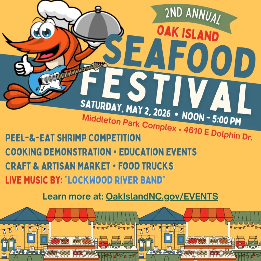 Upcoming Events Upcoming Events May Saturday, May 02, 202612:00 PM – 5:00 PMSeafood FestivalOak Island Recreation Center3003 E Oak Island DrOak Island, North Carolina 28465